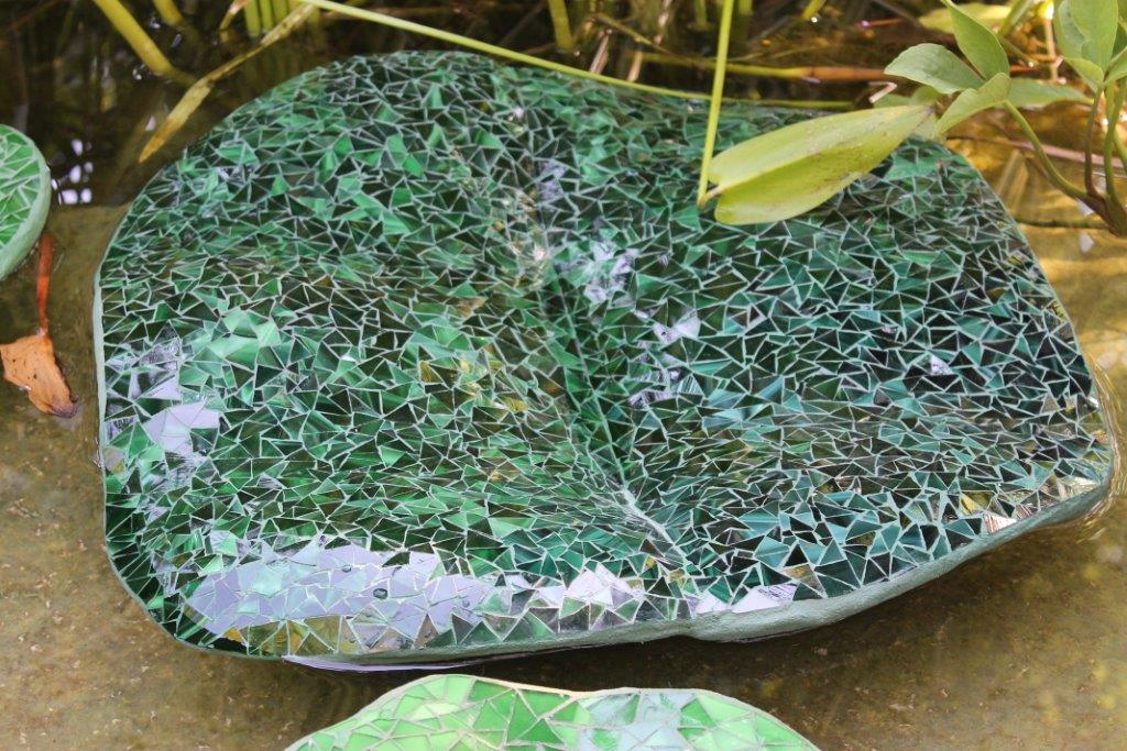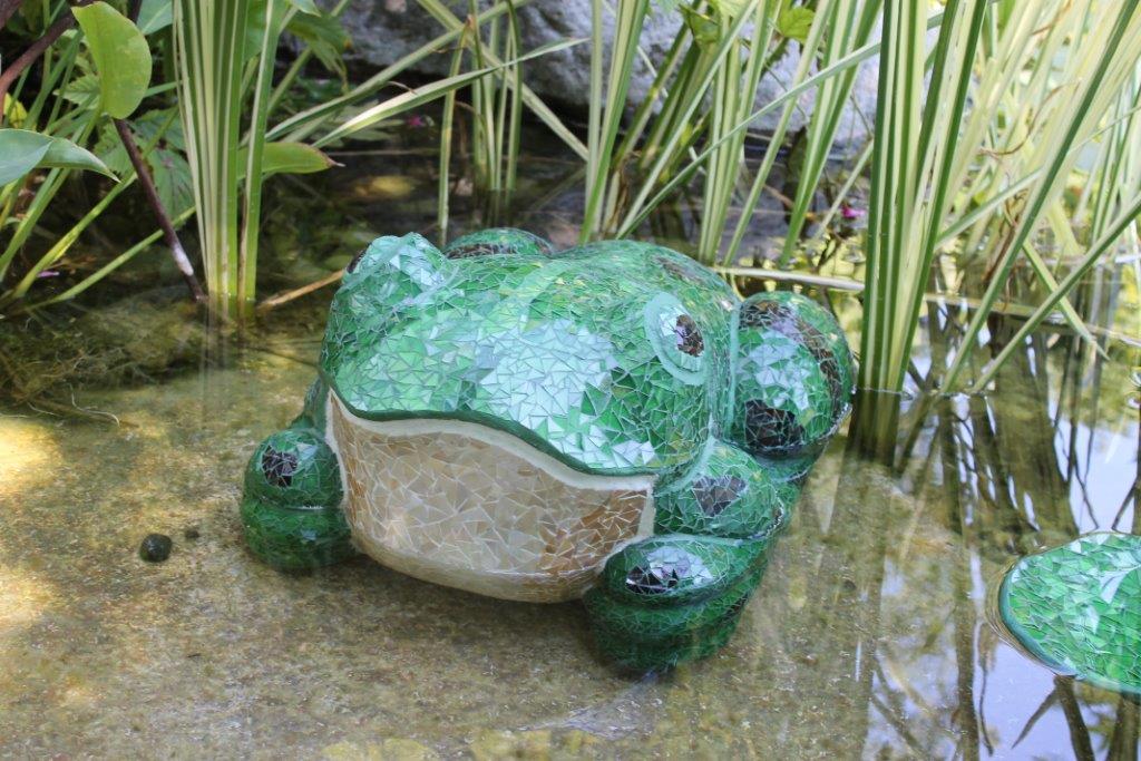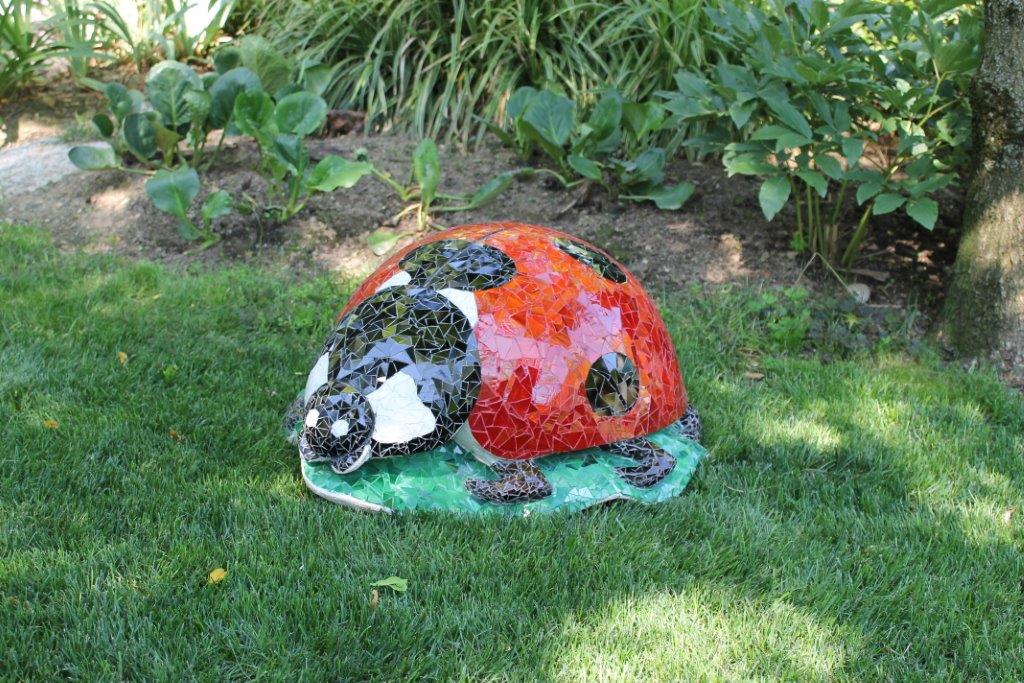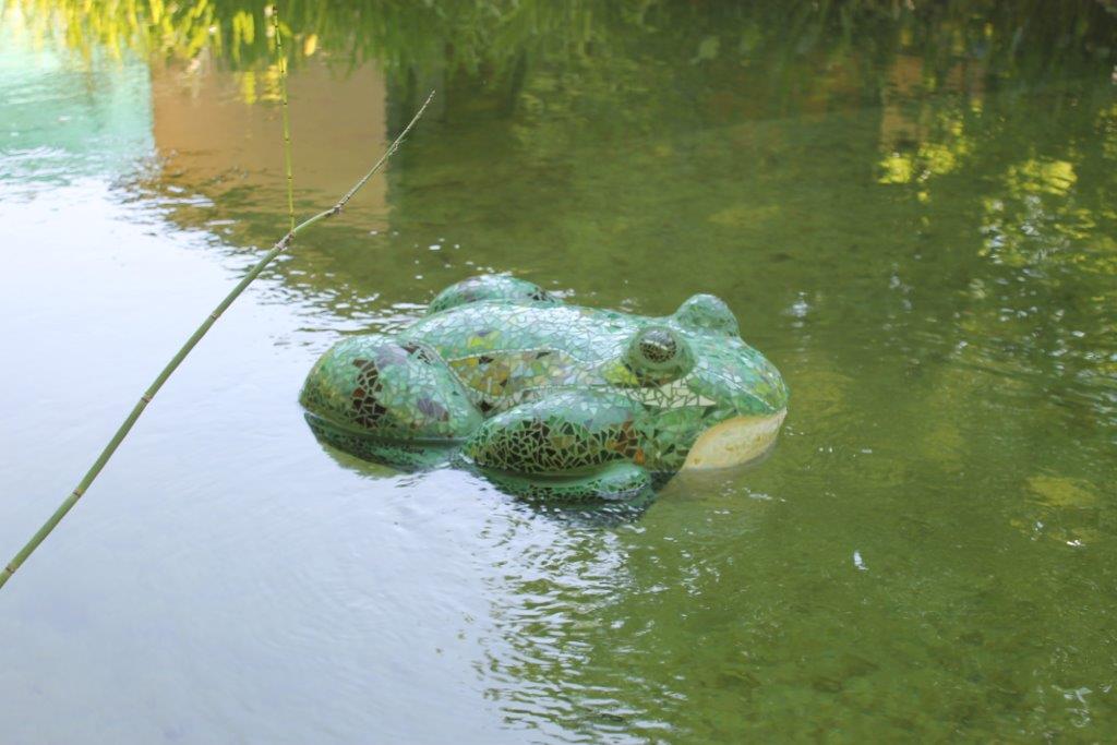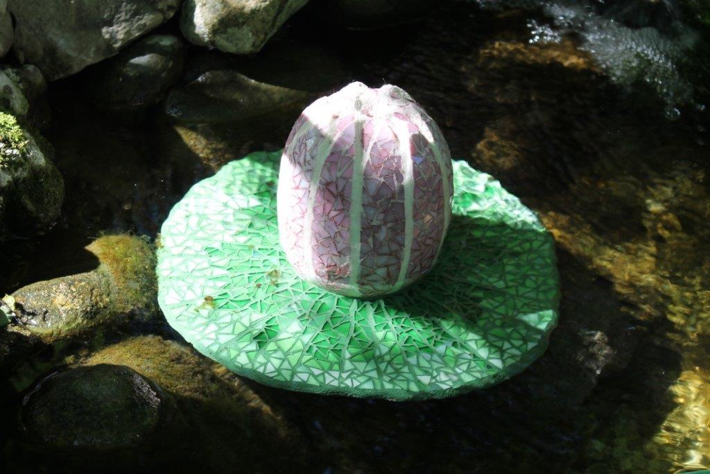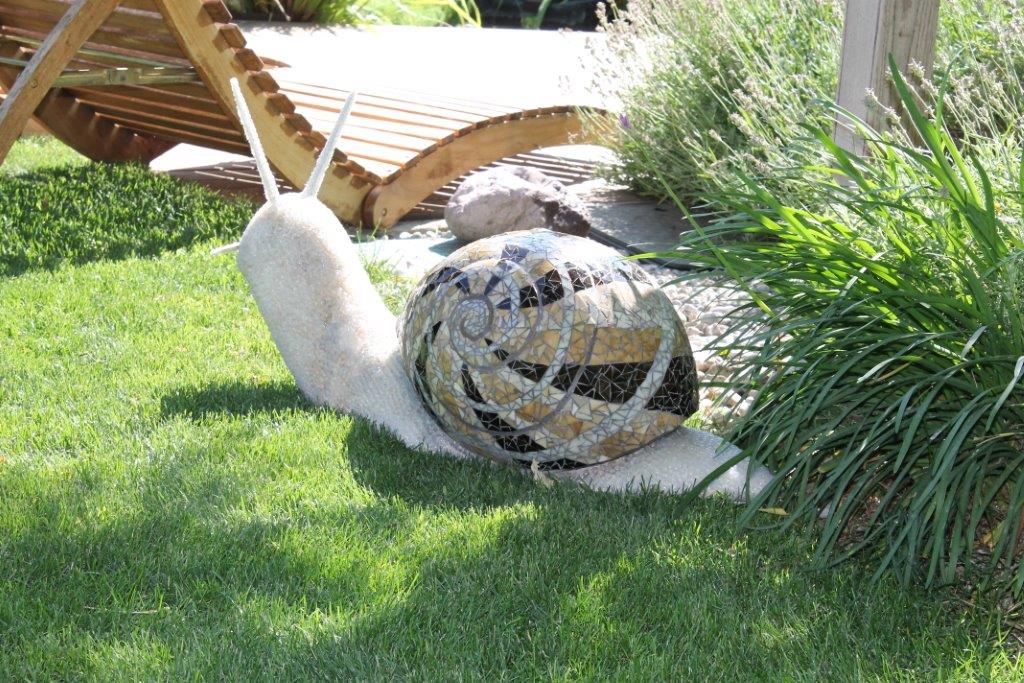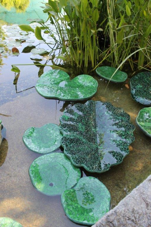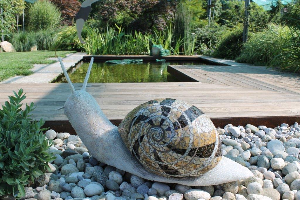 Rane, lumache, coccinelle, fiori e foglie. Persino un pesce. Sculture in Gas Beton resistenti all’acqua e a qualsiasi atmosfera ricoperte di prezioso mosaico con tessere di vetro, per un colore e una lucentezza che durano nel tempo.