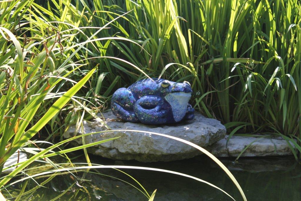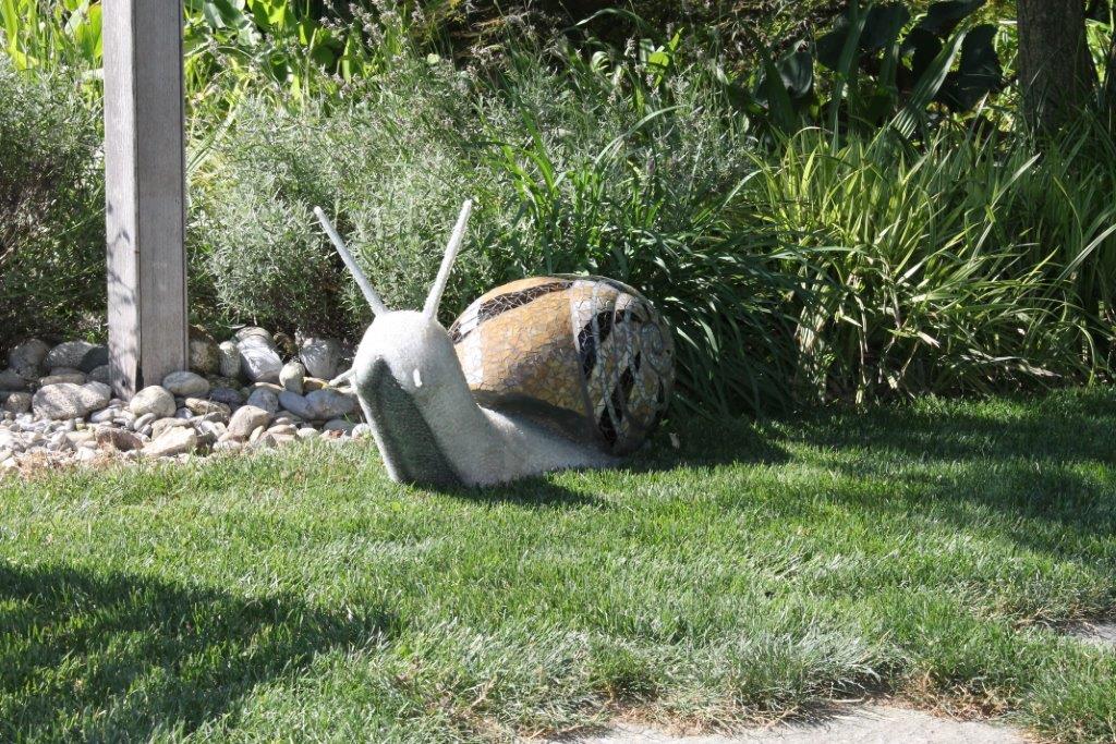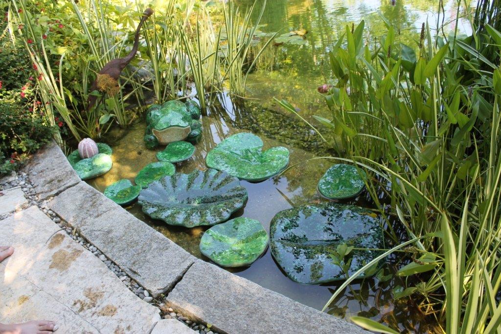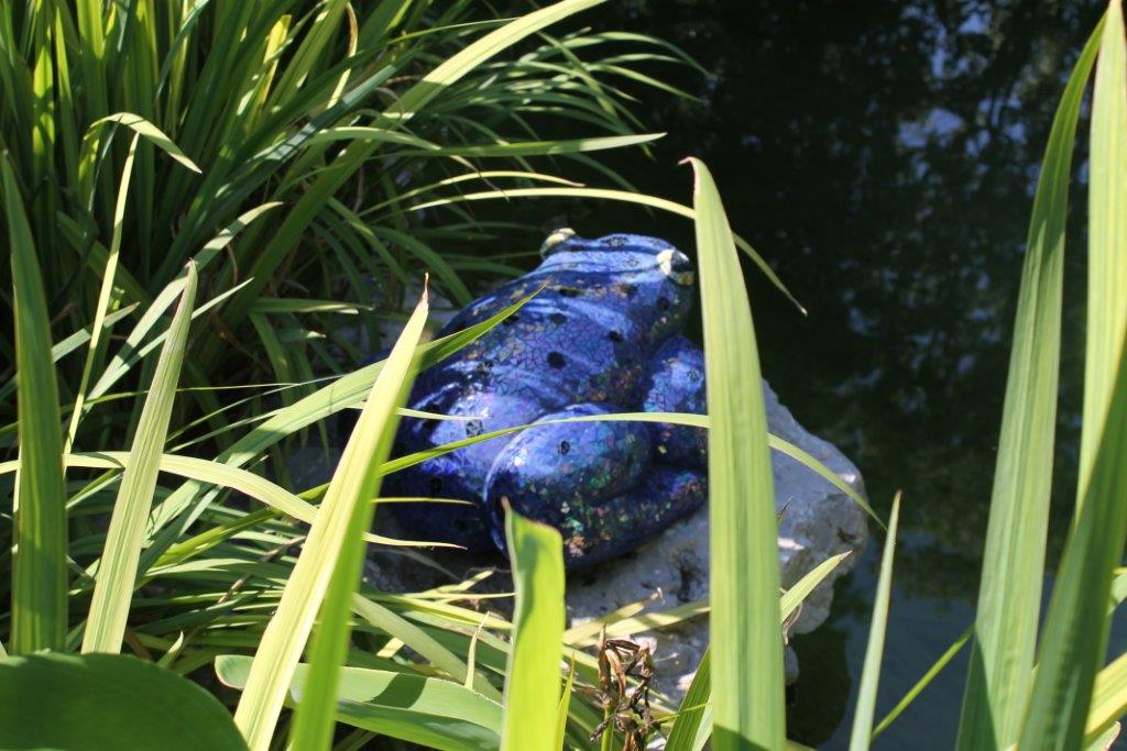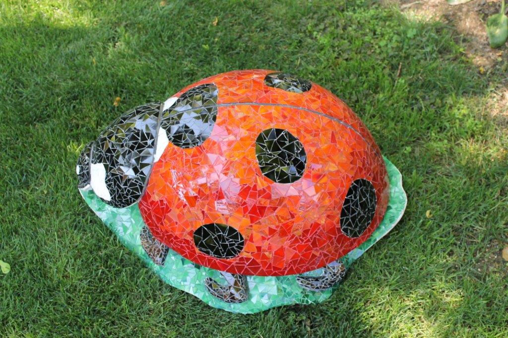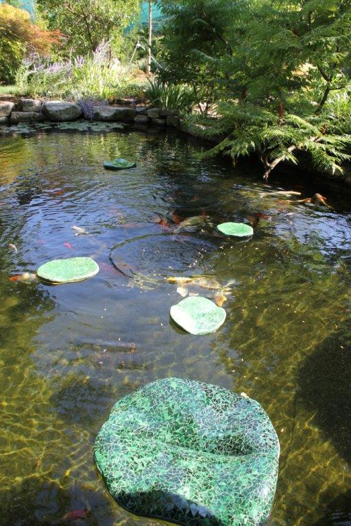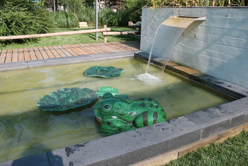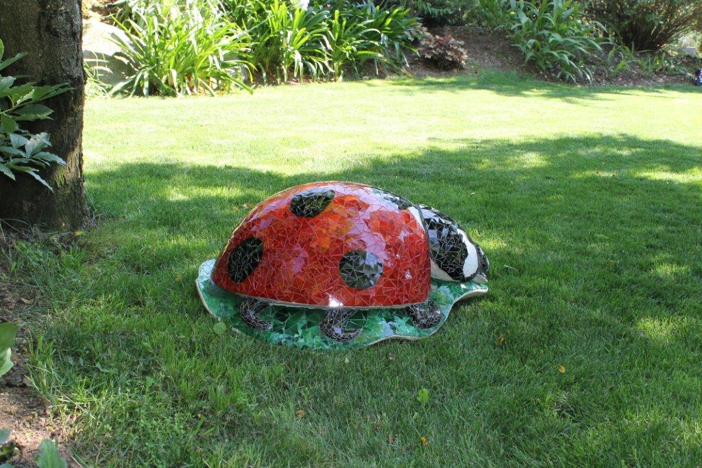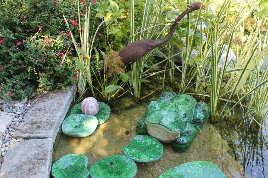 Rane, lumache, coccinelle, fiori e foglie. Persino un pesce. Sculture in Gas Beton resistenti all’acqua e a qualsiasi atmosfera ricoperte di prezioso mosaico con tessere di vetro, per un colore e una lucentezza che durano nel tempo.