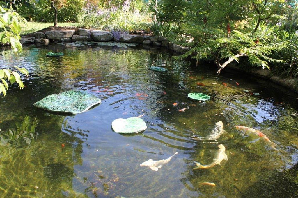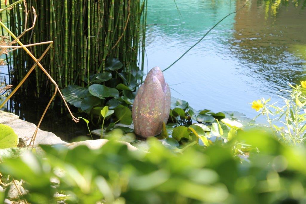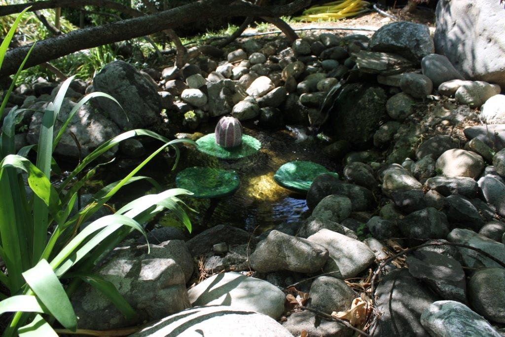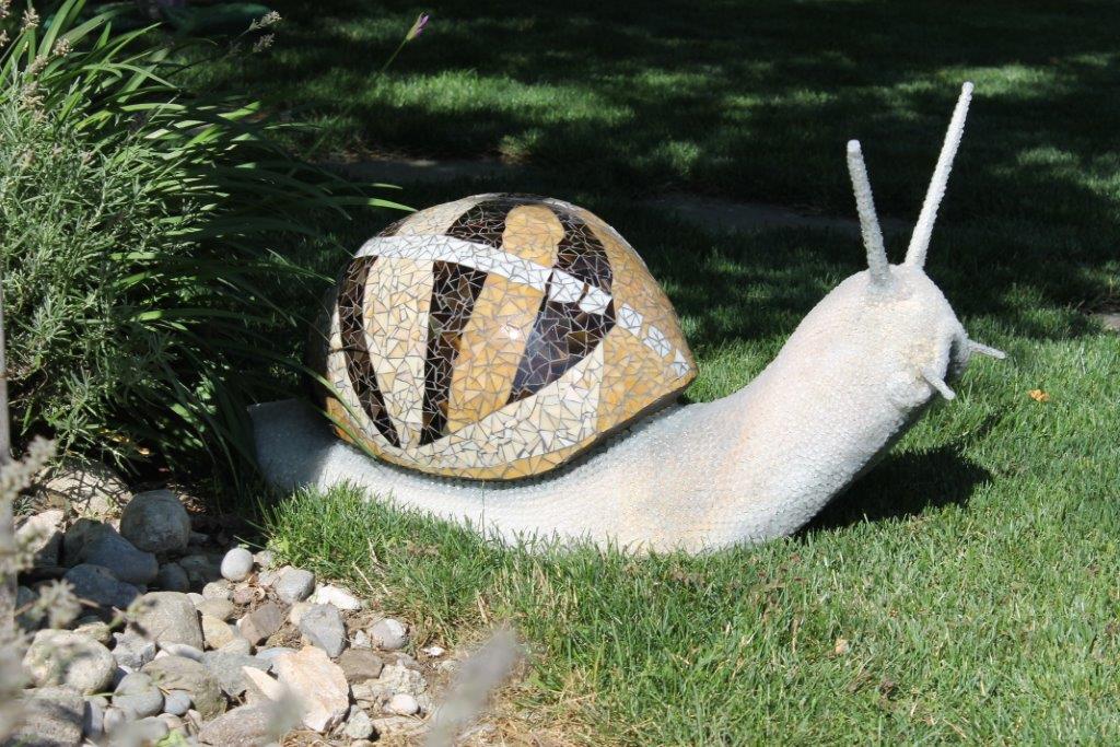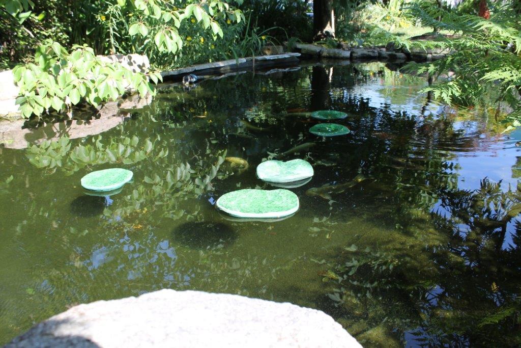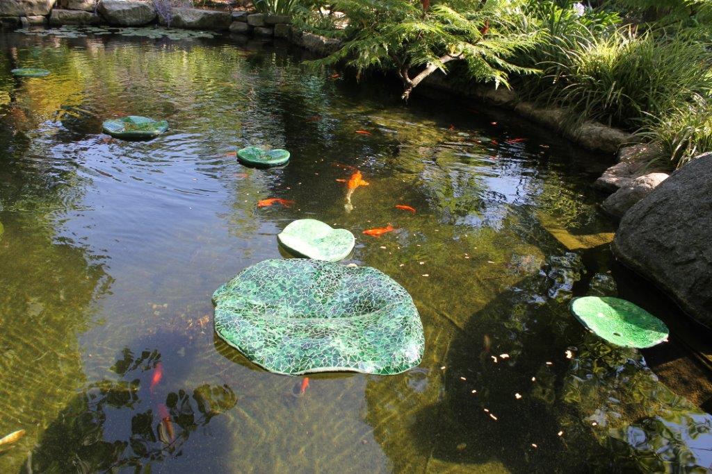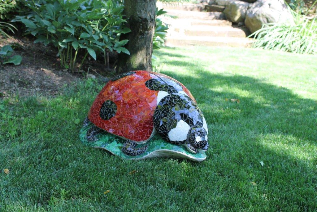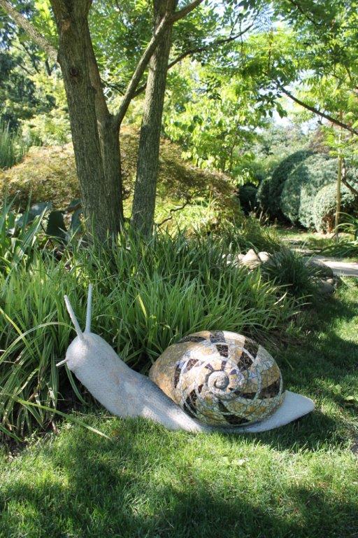 Rane, lumache, coccinelle, fiori e foglie. Persino un pesce. Sculture in Gas Beton resistenti all’acqua e a qualsiasi atmosfera ricoperte di prezioso mosaico con tessere di vetro, per un colore e una lucentezza che durano nel tempo.